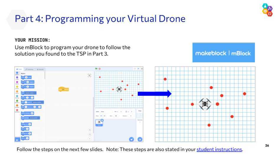 In this three-part breakout, students are introduced to the concept of networks and their real-world applications. In the first two parts, students will use online software and a linked Google spreadsheet to solve the classic Traveling Salesman Problem (TSP). In the third part, they will have two options: 1) For novice programmers, students will use mBlock, a block coding software, to program a virtual drone to travel the route they solved for in the previous part. 2) If students have more familiarity with coding, students will explore a Python program in Google Colab to model and solve the traveling salesman problem.